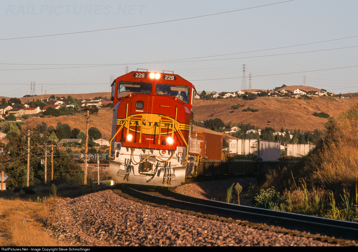 Close to sunset, new Santa Fe SD75M No. 228 leads a 589 intermodal train out of Houston, TX, at Hercules, CA. The train will now briefly skirt Suisun Bay before passing the big UPS facility at North Bay, and then head for the yard at Richmond. In later years, Santa Fe's SD75s saw service on BNSF unit coal and grain trains, a testament to their pulling power.