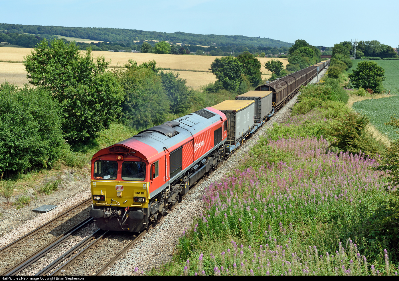 | A rare daylight freight train from the Channel Tunnel, the 13.49 Dollands Moor to Daventry International Rail Freight Terminal (DIRFT) has just passed Charing behind DB Cargo 66 118 (in DB Schenker livery) on a very warm (30C) Sunday afternoon. (Much to my surprise a secend tunnel freight came up a little over an hour later). |