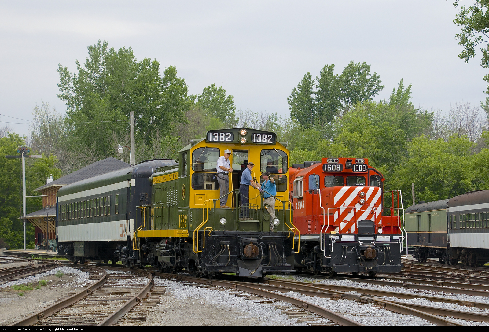CN 1382 is heading to the eastern end of Exporail to shuffle some cars around as it passes GP9 CP 1608.