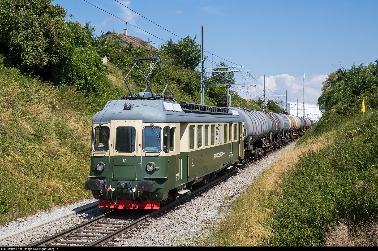 | Former Südostbahn (SOB) railcar BDe 4/4 # 80 of Depot und Schienenfahrzeuge Koblenz (DSF) with a empty tank car train from the fuel depot of Tägerschen, near Bettwiesen. The train run for the "Eisenbahndienstleister Gmbh" (EDG) railway from Bettwiesen via Wil-Winterthur to Limmattal shunting yard with 17 empty tank cars. |
