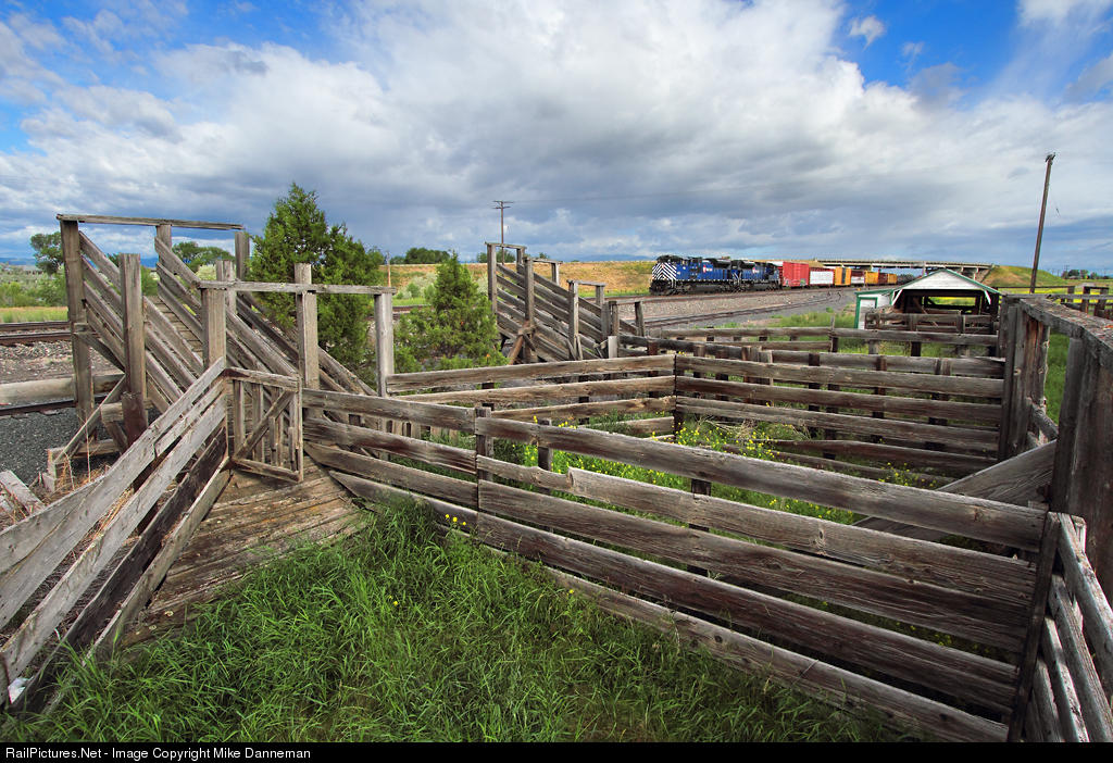 Montana Rail Link’s Missoula to Laurel manifest freight passes the old stock pens and loaders at Toston, Montana, on July 1, 2018. The rustic facility has dual loading shoots that appear to be spaced to load two 40-foot stock cars at once, with the eastern loader also equipped with two levels to load double-deck cars. How neat it would’ve been to watch them load Northern Pacific “Pig Palace” stock cars oh so long ago.