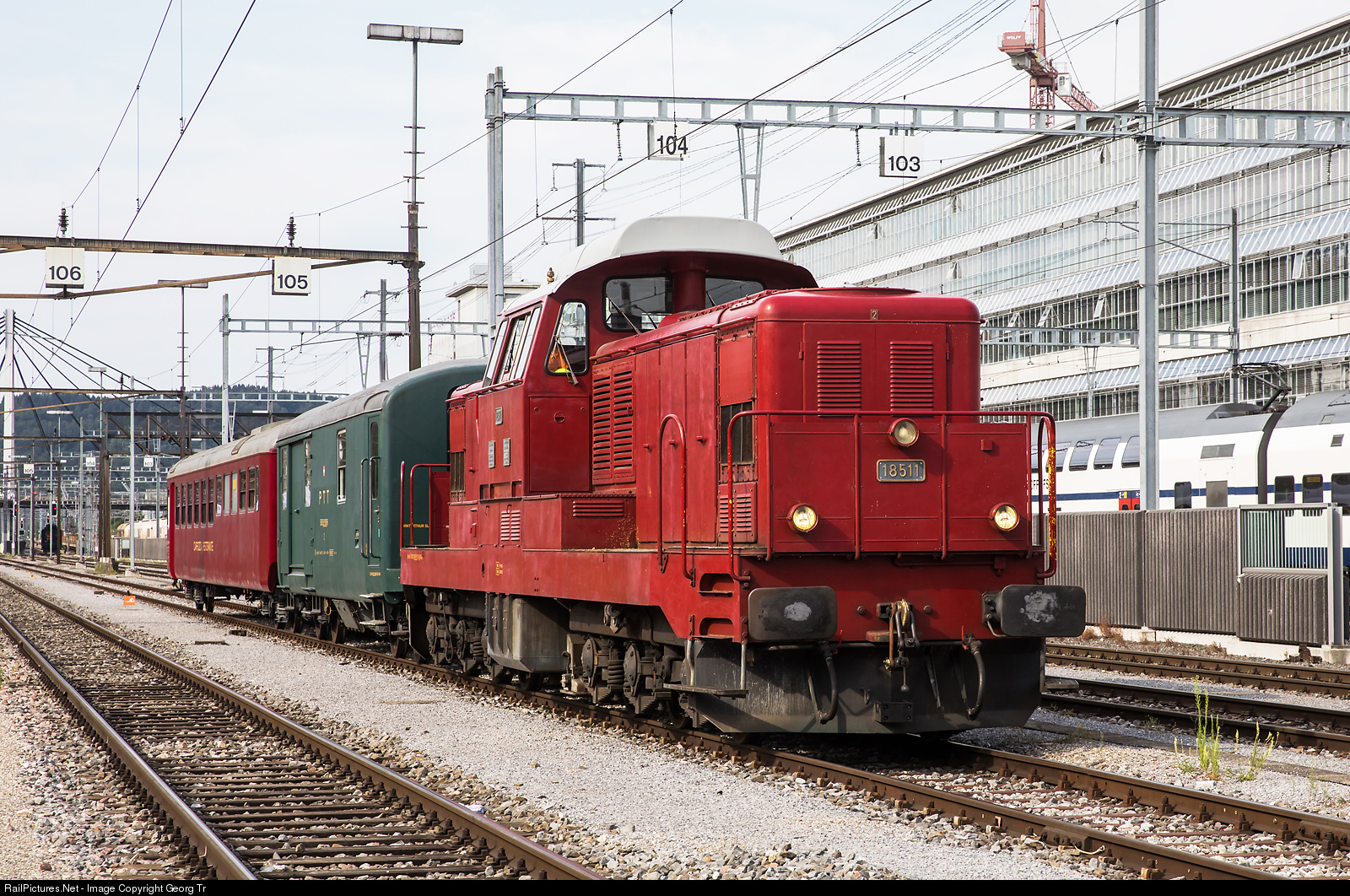 Former SBB diesellocomotive Bm 6/6 # 18511 of Schorno Locomotive Management Gmbh in Winterthur freight yard. The former mail car Z # 55 85 92-29 609-6 and the dining car WR # 55 85 88-35 452-9 CH-SLM (former SOB Gipfeli Express dining car) are owned by the "SLM Gmbh" as well.