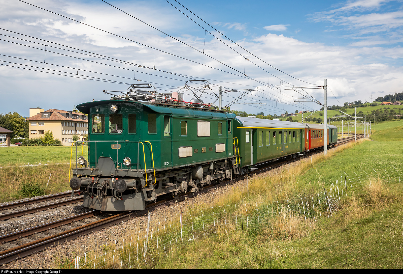 Passenger train of the Schorno Locomotive Management Gmbh from Herisau via St.Gallen GB-Wil to Winterthur, between Gossau (SG) and Flawil. Former Bodensee-Toggenburg-Bahn (BT) locomotive Be 4/4 # 11 from 1931 (SLM/SAAS) is pulling former SBB first class standard car type II # 50 85 18-33 617-9 CH-SLM, former Südostbahn "Gipfeli-Express" dining car WR # 55 85 88-35 452-9 CH-SLM and former mail car Z # 55 85 92-29 609-6 CH-SLM.