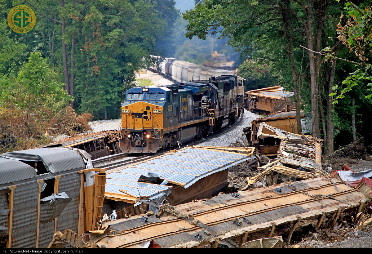 Train W62 eases through the mess left behind after 22Q had a derailment on 7-5-18.