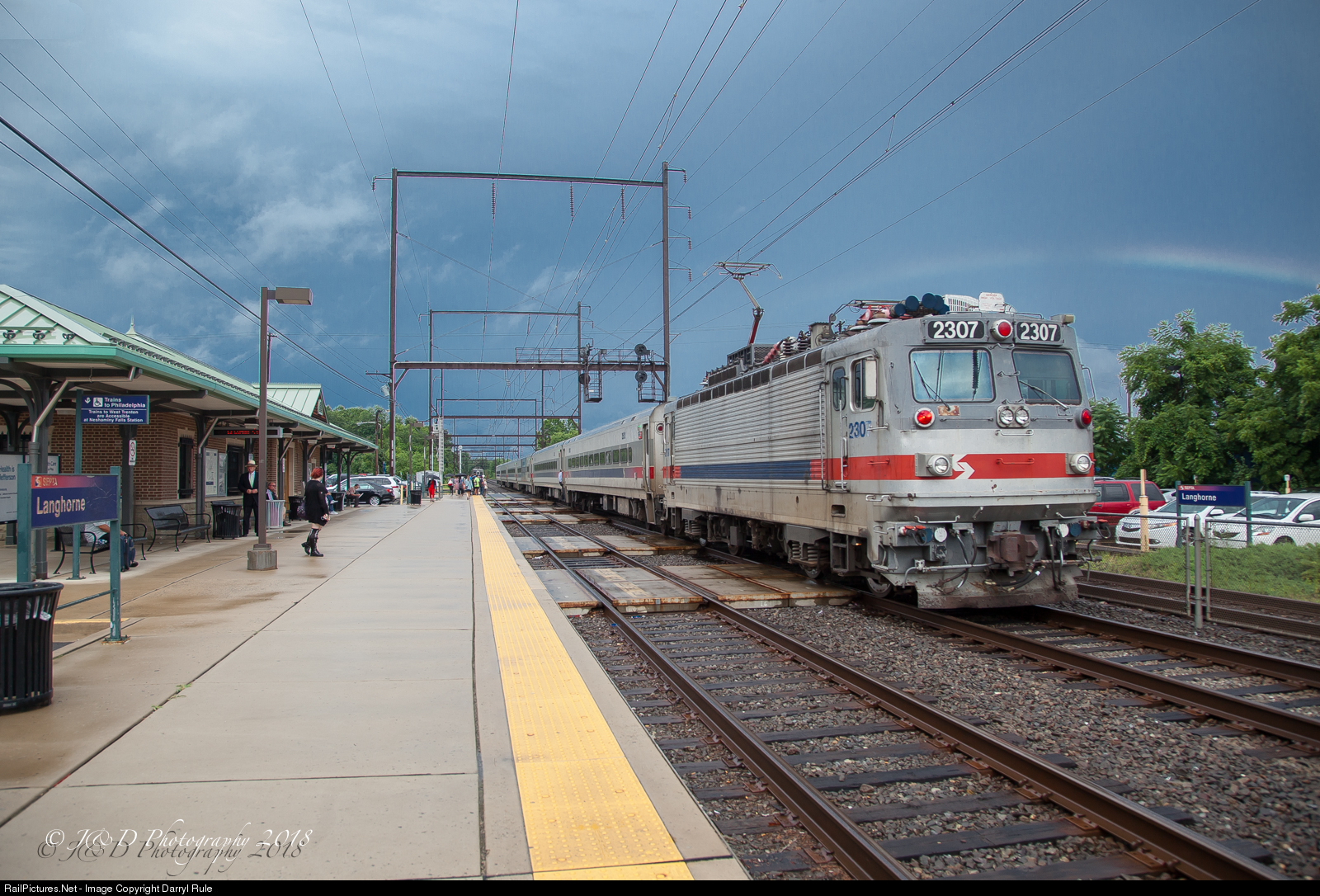 Finally - a definitive answer as to what is at the end of the rainbow, and it isn't a pot of gold. It's a SEPTA AEM-7 running out its final miles before being replaced by the new ACS-64 fleet. Here, SEPTA train #6374 departs Langhorne, PA shortly after a strong summer thunderstorm drenched the area, bringing out a rainbow in the sky behind the train.