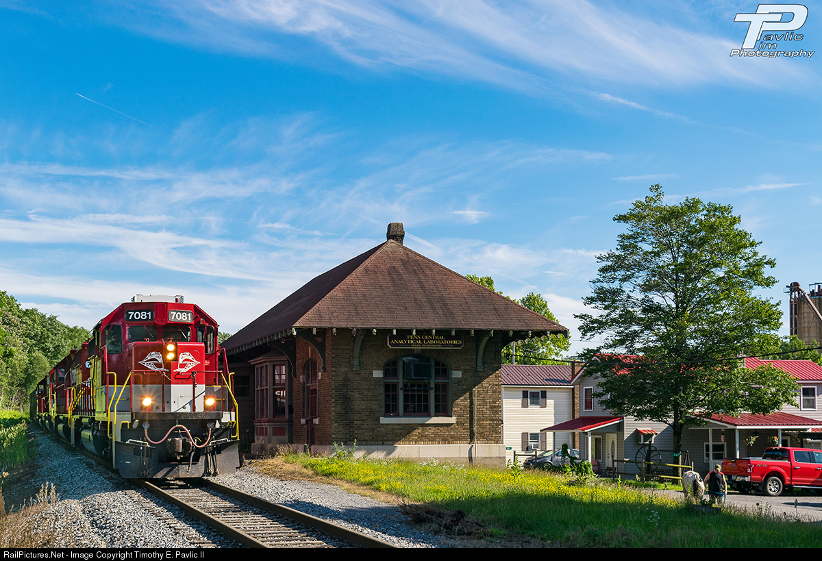 RJ Corman brings a loaded train west through Bigler, PA, passing the former Beech Creek Railroad (New York Central) station. Some time post-Penn Central, the structure became a private business named Penn Central Analytical Laboratories, and still bears the signage. The ex-PRR station for Bigler is a wooden structure, which still stands about 100 yards away from here and is in private storage use.