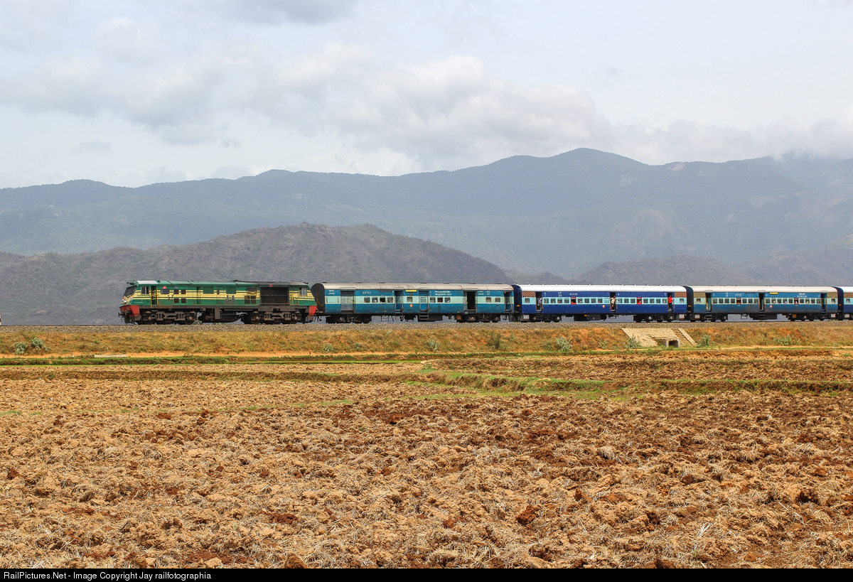 GOLDEN ROCK WDP-3A with Tirunelveli bound passenger train passing arable land of Azhwarkuruchi with Western Ghats in background