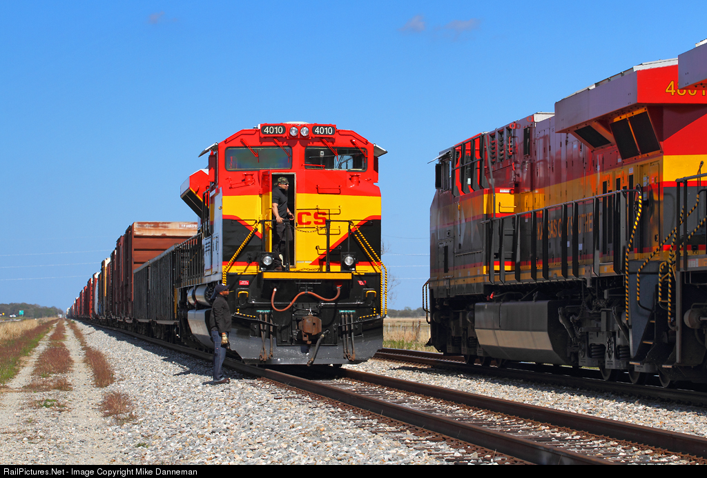 Tucked away in El Toro siding, the crew of a southbound Kansas City Southern freight led by EMD SD70ACe No. 4010, inspects a northbound train passing on the main line on March 14, 2013. This location is on KCS’s Rosenberg Subdivision in Texas, also known historically as the “Macaroni Line.”