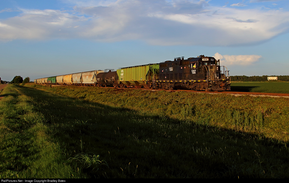 In the last seconds of light CAGY GP11 #1806 (former IC) leads a Columbus & Greenville Railway Train West as they pass through Baird, MS. Bound for Greenville, MS. With interchange from Canadian National at Greenwood, MS.