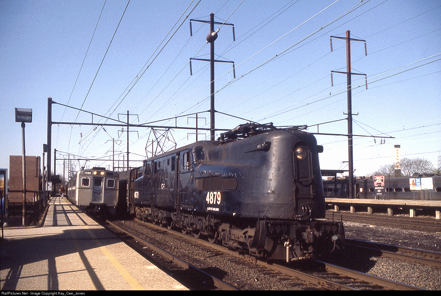Eastbound GG-1 4879 passes through Rahway as eastbound and westbound Jersey Arrows pickup local commuters.