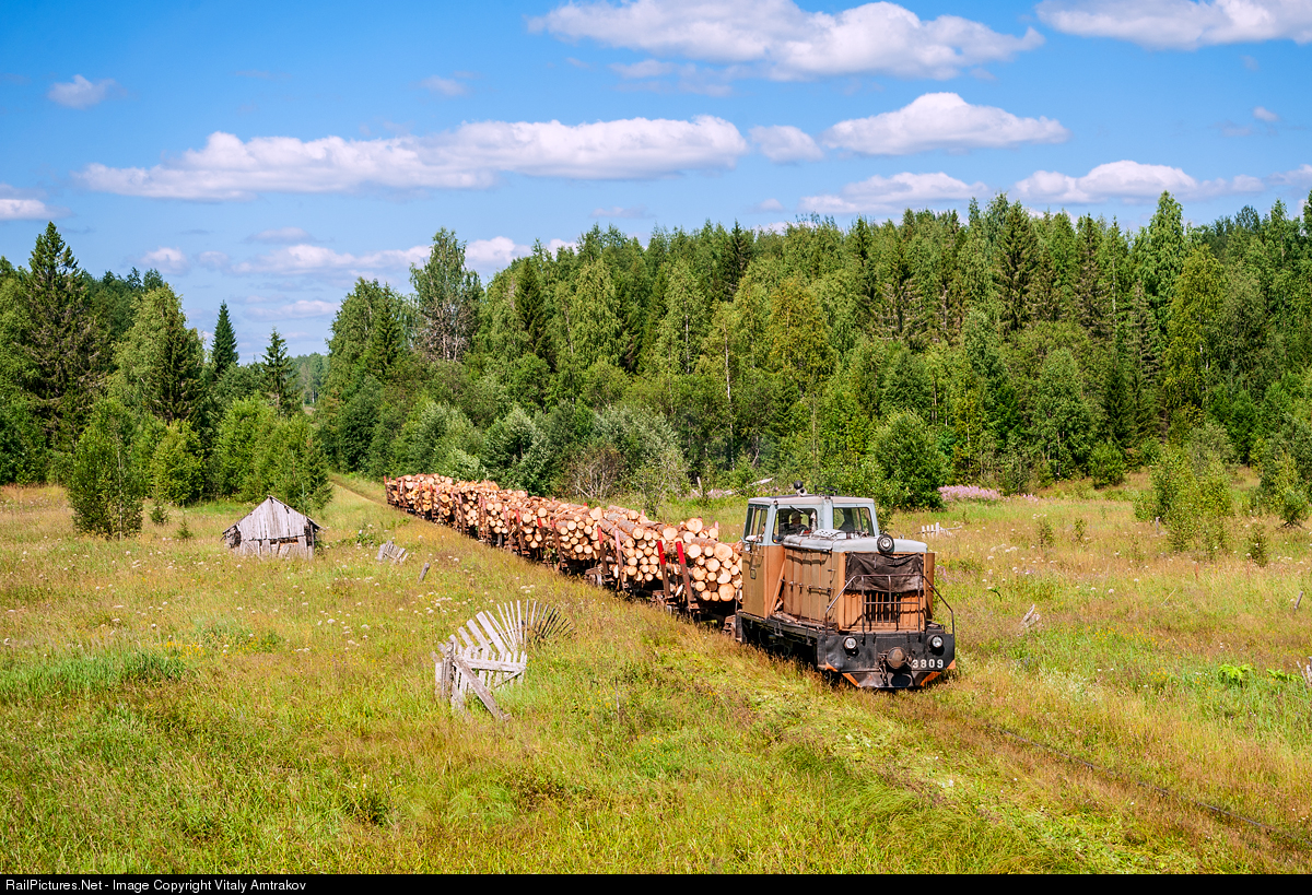 The TU6A-3809 narrow-gauge diesel locomotive is leading a freight train loaded with wood