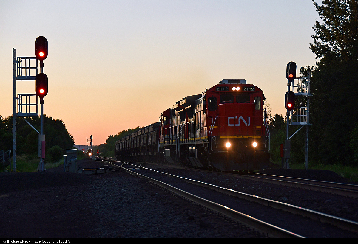 | A train of taconite rock from the Cleveland-Cliffs owned United Taconite Thunderbird pit moves onto the CN Missabe Sub main two while a train of U.S. Steel Minntac plant taconite pellets for the dock at Two Harbors comes up to take main one. |