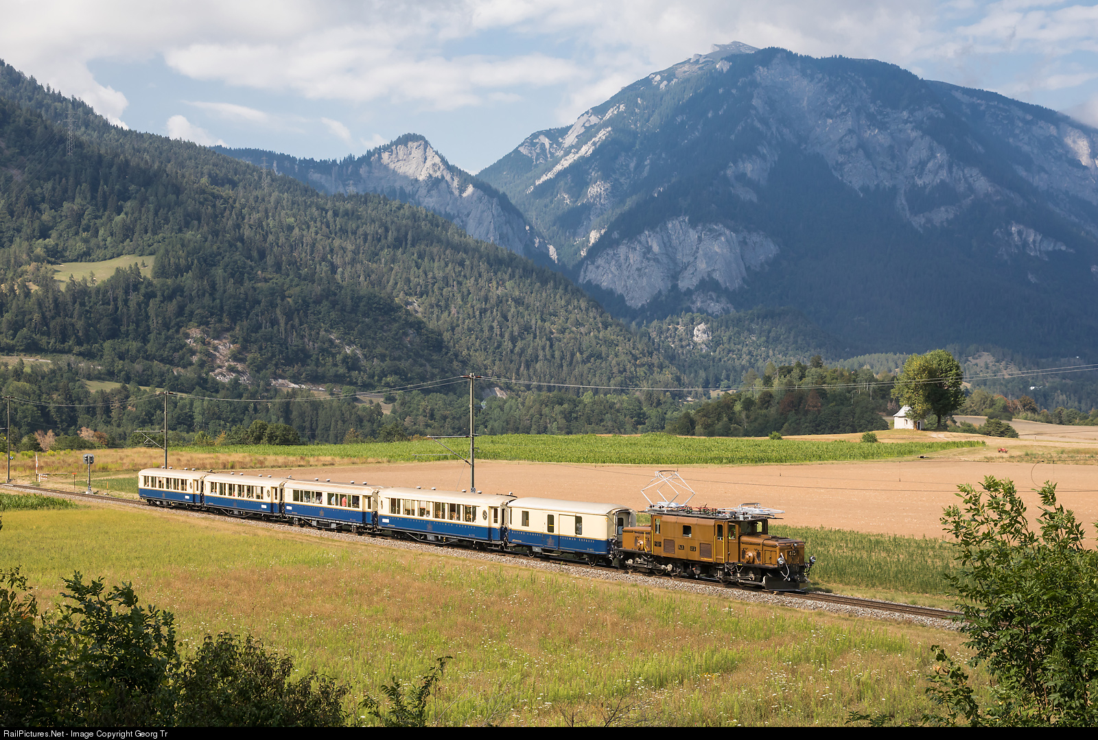 | The "C-C" or "Rhaetian Crocodile" Ge 6/6 I # 415 of the RhB is pulling train # 2155 "Glacier Pullman Express" from Chur to St.Moritz over the Albula line between Reichenau-Tamins and Bonaduz. The train started at Zermatt the day before and ran via Visp-Brig-Oberwald-Furka pass (cars of the DFB)-Realp, overnight stay was in the 5 star Chedi hotel in Andermatt. Today the journey was Andermatt-Oberalp pass-Disentis-Chur. The train consist is: baggage car D # 4051, parlor cars As # 1143, Piano-Bar car WR-S # 3820, parlor cars As # 1144 and # 1141. |