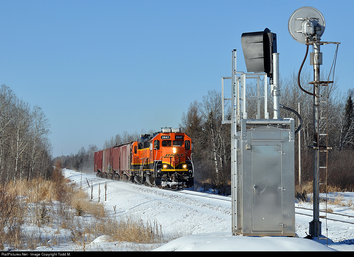 | The BNSF's trackage rights once a week trip from Kelly Lake to the Minorca mine to deliver loaded bentonite hoppers about to pass a new signal recently installed by CN. Quite the contrast in styles. |