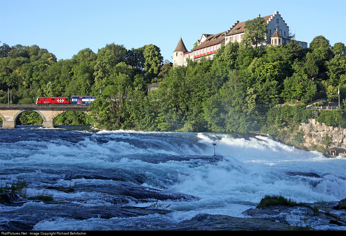 | Re 420 207 at the end of a HVZ-D train (doubledeck train for peak hours) is crossing the bridge above the Rhine Falls. |