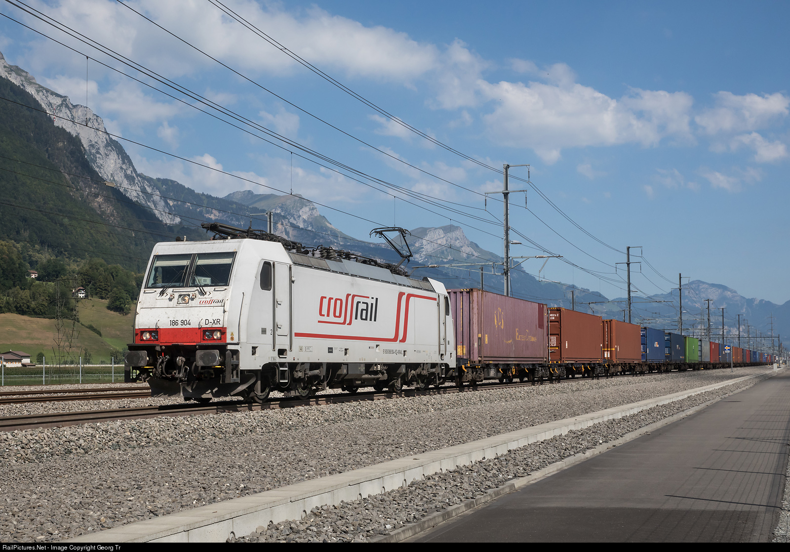 Train 43003 from Rheinhausen Hafen/Germany to Pomezia Santa Palomba/Italy at Rynächt, near the north portal of the 57 kilometer long Gotthard Base Tunnel (GBT). This is a train of TXLogistics, the locomotive Bombardier TRAXX F 140 MS 186 # 904 was built in 2007 and is owned by leasing company Macquarie European Rail Limited (Luxembourg Branch), Luxembourg. Because it ran for Crossrail from 2008 to 2017, it has still this lettering on the sides.