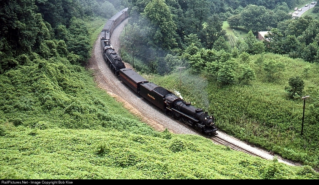 The NKP 587 and NW 1218 are doubleheading up the kudzu-covered Southern Loops, on their way to Asheville, NC, during the 1989 NRHS Convention. Today, the 587 is in pieces in Kentucky, and the 1218 is in repose in Roanoke.