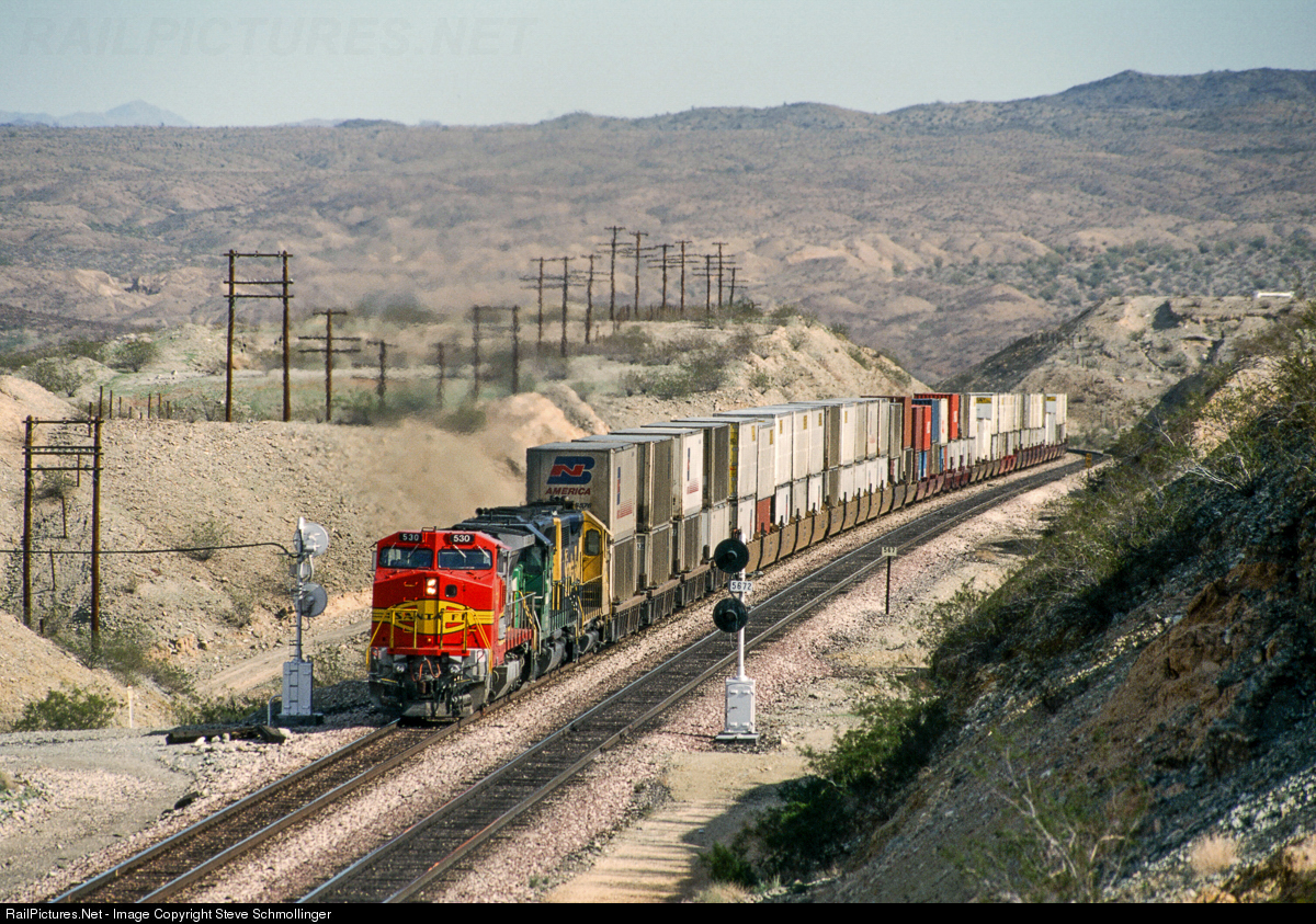 In the early days of the BNSF Railway, a Santa Fe B40-8W leads a westbound stack train at Park Moabi, CA, not far from the Arizona-California border. This is a very desolate but starkly beautiful area of the Mojave Desert, which gives way to the high desert and Arizona Plateau far to the east.