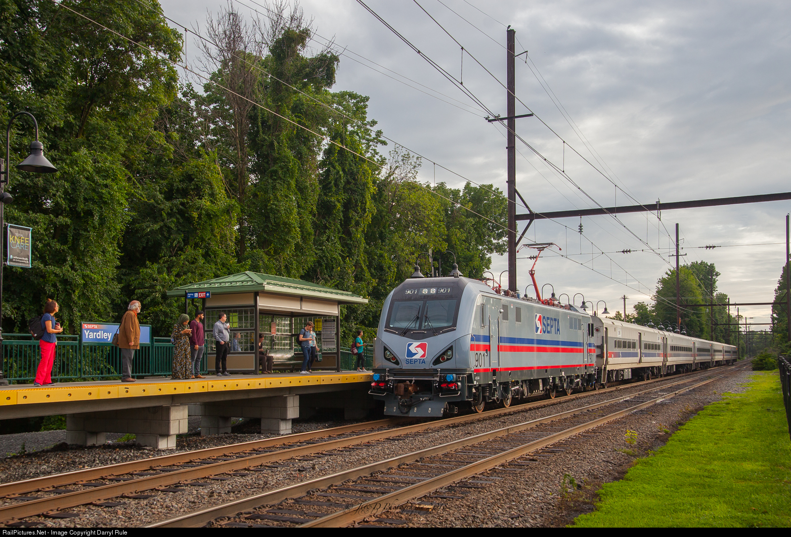 | New Meets Newer - SEPTA ACS-64 #901 leads its first inbound revenue run to Philadelphia from West Trenton, NJ into the recently fully re-opened station at Yardley, PA. The station previously occupied both sides of the tracks here, and had low level platforms. The project to move all passengers to the inbound side as well as install elevated platforms finally wrapped up about a month ago. Soon SEPTA's AEM-7 fleet will join the old station as only memories. |