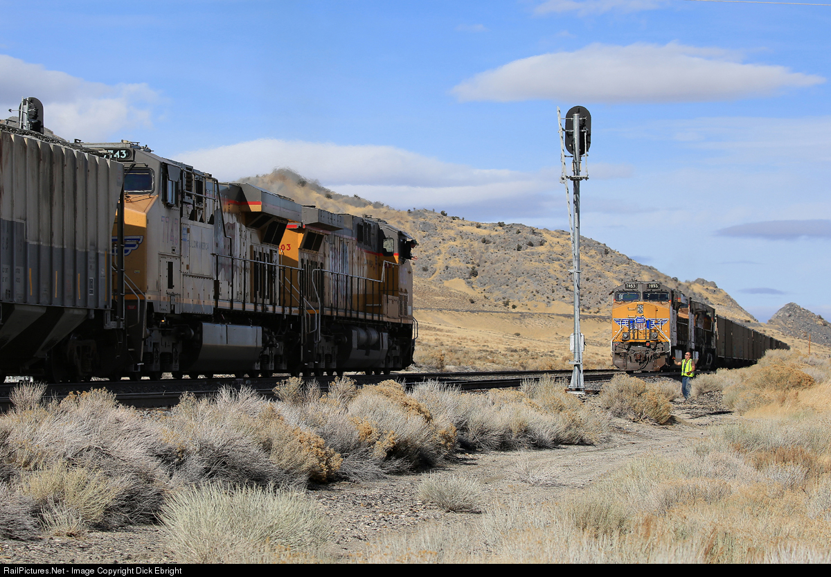 | UP 7853 east in Cliffside siding is waiting for UP 6803 west to lug it’s manifest train, the MRORV-07, up the 1% grade of Silver Zone Pass in eastern Nevada. The conductor is on the ground giving the westbound a roll by.