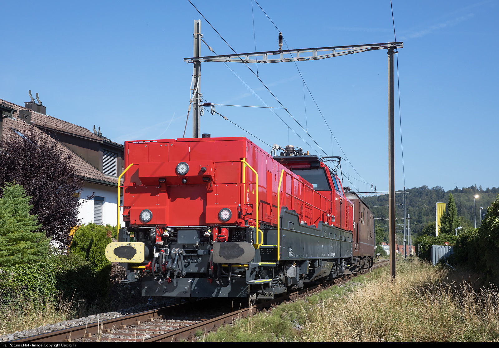 | Dual power locomotive Aem 940 # 003 from Alstom for the SBB on a test run in diesel mode (900 kW) from Baden Oberstadt to Mellingen near Dättwil. The locomotive Re 425 (Re 4/4) # 180 of the BLS is load and probably electric braking. |