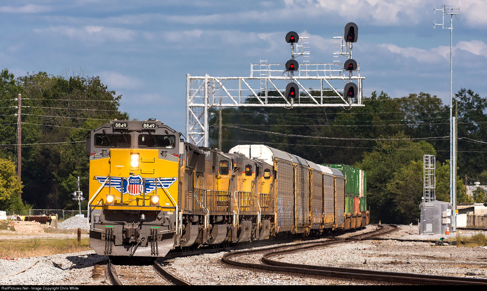 | UP 8849 leads the NS 225 - UP ZAILC Blue Streak service intermodal past Meridian Union Station before it interchanges to the Kansas City Southern. Once on the KCS Meridian Sub, it will travel to Shreveport, LA where it will interchange to the UP and onto home rails to Los Angeles. |