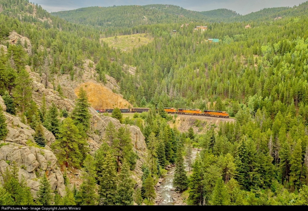 | A BNSF trackage rights westbound freight is almost through the tunnel district as it starts on the 12-degree horseshoe curve just east of Pinecliffe. The curve is the sharpest east of the Moffat Tunnel, and takes the train through the shortest of the Tunnel District tunnels Tunnel 29, which is virtually below me. |