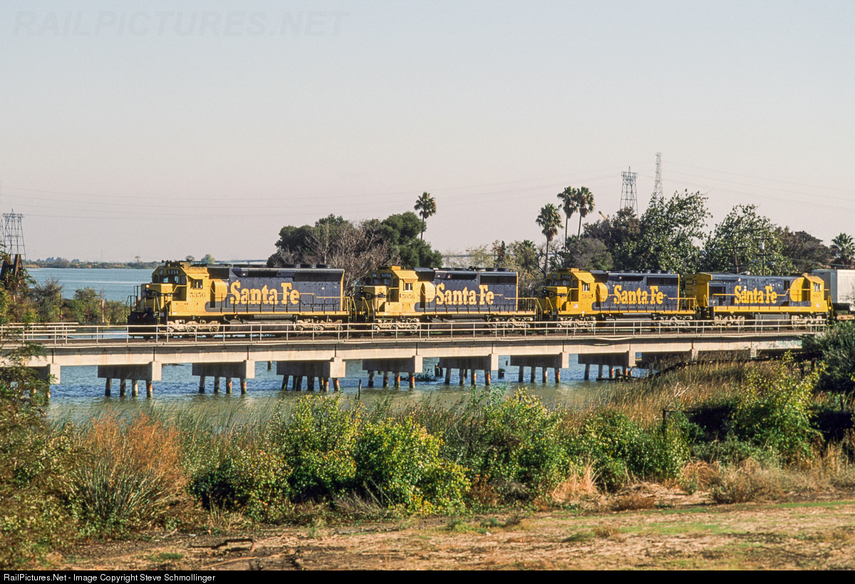 On a beautiful morning in November 1993, Santa Fe 5386 West, crosses the concrete trestle at the edge of Suisun Bay in Antioch, CA. The train is a hot 189 train out of Chicago, and is headed for Richmond, CA, in the North Bay near San Francisco. Trains decelerate coming into Antioch, and crank it back up once they clear nearby Pittsburg.