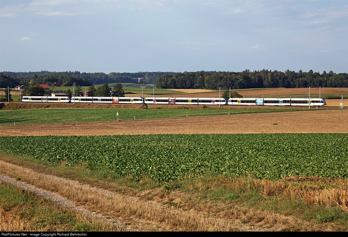 Articulated lowfloor regional trains with four "GTW" RABe 526 are not in daily use, but exemptions are possible. For a great event this S33 service Winterthur – Schaffhausen is running today with one AK (short version, 526 742) and three AKL (long version, 526 771, 526 783, 526 761).