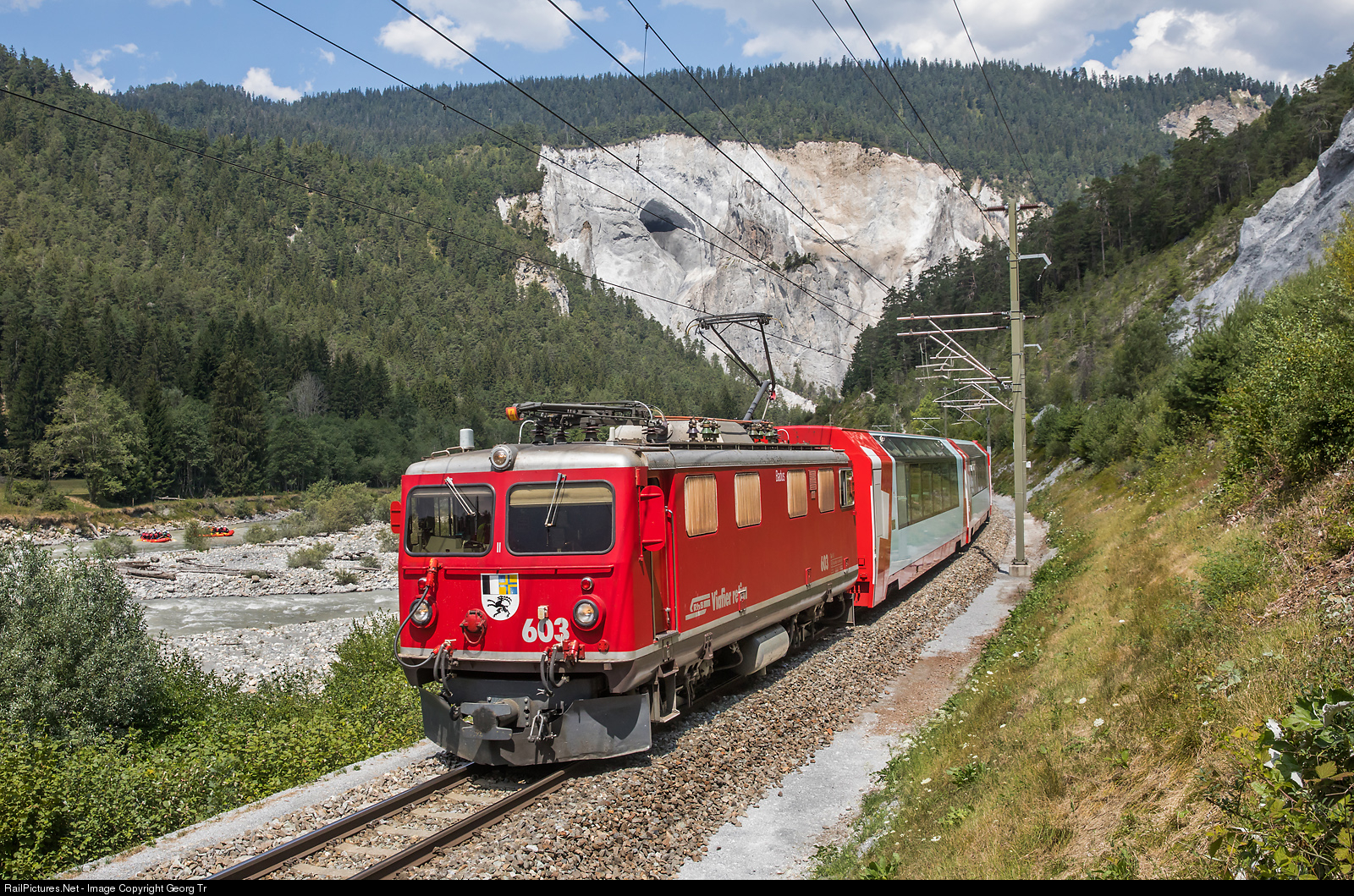 Sometimes, when the Rhaetian Railway is short in power, the vintage Ge 4/4 I locomotives with 1184 kW are used to pull short passenger trains (usually they are in the freight service for the Albula tunnel II only). This day, the Ge 4/4 I # "Badus", which was built in 1947 by SLM, MFO and BBC and is in service for 71 years now (in a few days), is pulling the prestigious GLACIER EXPRESS GEX # 905, running from St.Moritz to Zermatt, on the section between Chur and Disentis. The train is running along the Vorderrhein through the impressive Ruinaulta gorge between Versam-Safien and Valendas-Sagogn.