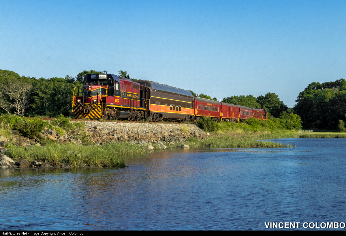 | Mass Coastal 2007 slows the Cape Cod Central dinner train to a stop so passengers can take in the views of the Pocasset River. 2007 is a former Santa Fe GP9u built in 1956 by EMD. |