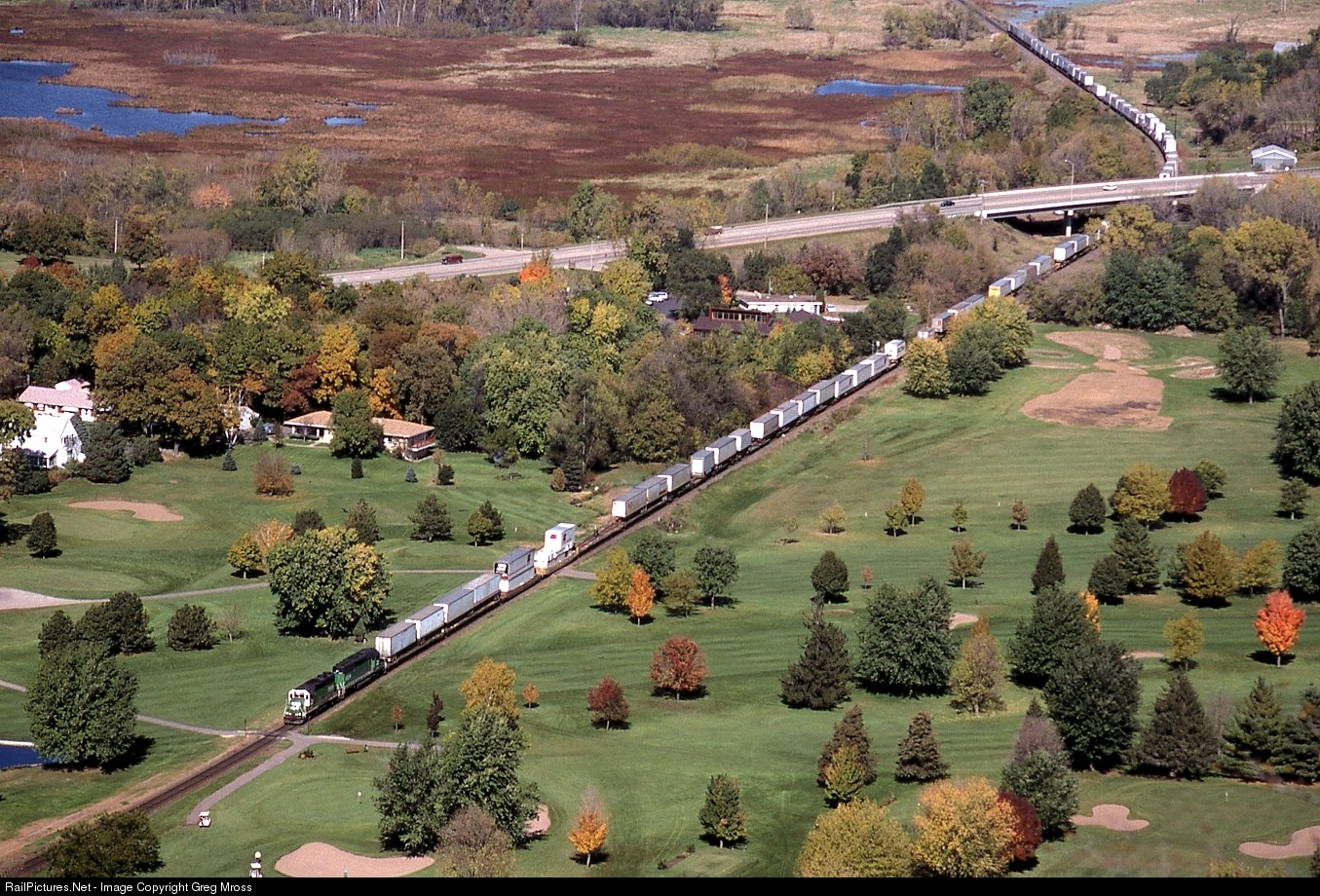 Fore! BN 2932 splits the public golf course below Grandad Bluff in two as it departs La Crosse, WI in October of 1991.