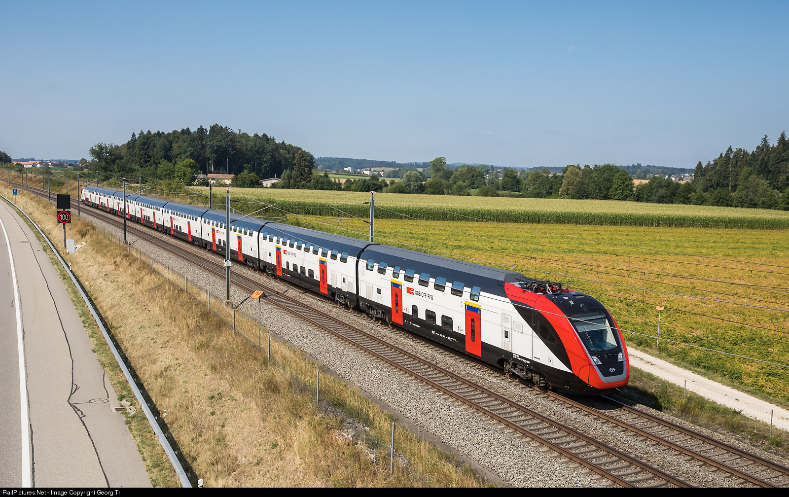 Since a few weeks, few of the new doubledeck trains for long distance services, FVD (Fern Verkehrs Doppelstockzug) or Bombardier TWINDEXX Swiss Express, RABe 502 are in the "gelenkter Einsatz" (steered use, which means they are running a service, for which the planned trainset is on reserve) even over the 200 km/h "highspeed" stretch of the NBS (new fast line) between Bern and Olten. RABe 502 # 207, a 200 meter Interregio version, is running the IR # 2169 of the IR16 line from Bern nonstop to Olten, then via Aarau-Brugg-Baden to Zürich, near Hindelbank. The SBB gets 30 of this IR version of the FVD.
