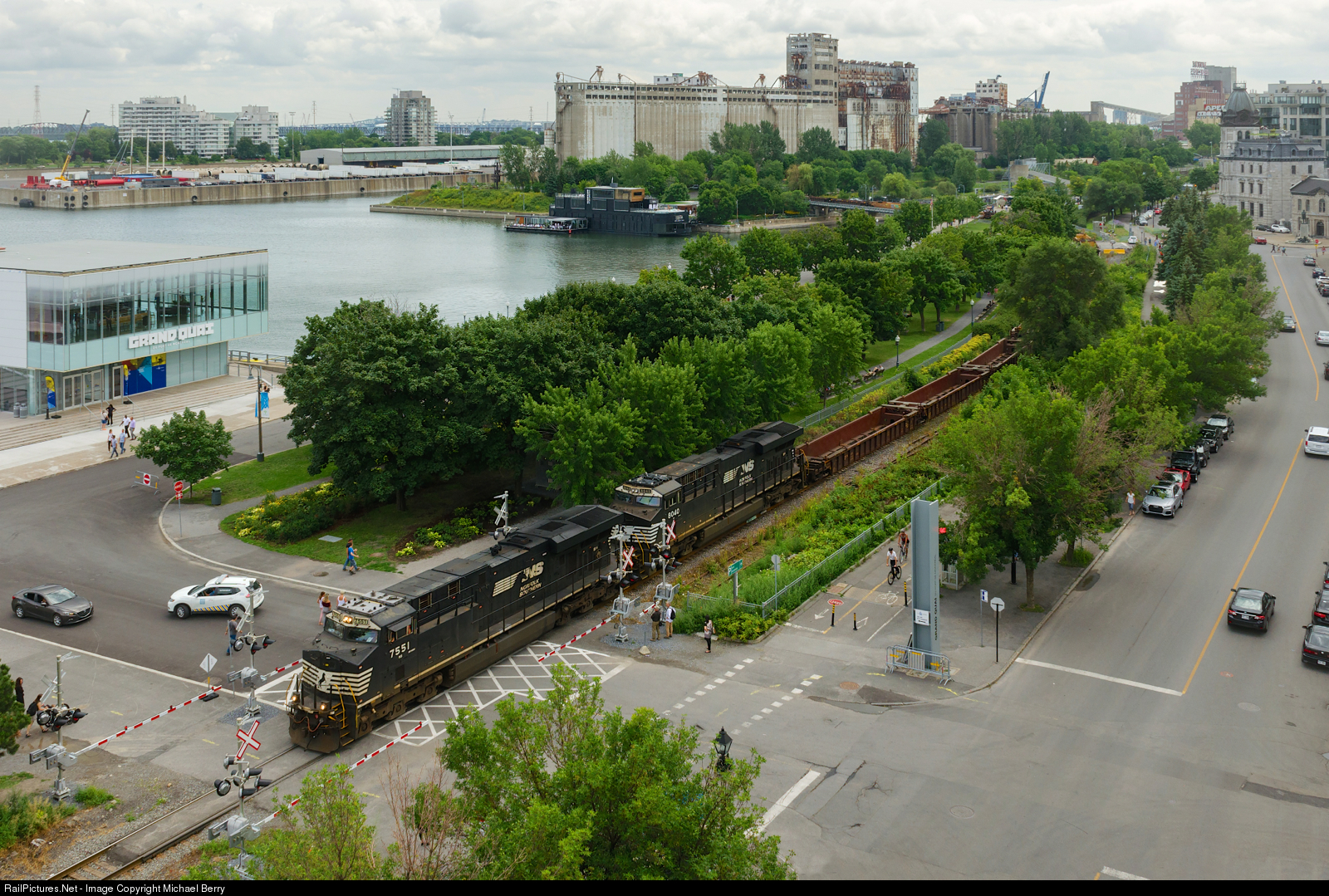 | Borrowed NS power into the port. Borrowed NS GEVO's NS 7551 & NS 8040 lead CN 543 into the Port of Montreal with baretables as they go over a crossing with newly installed gates. In the background at right is the out of use grain elevator #5. My vantage point is a tower that is part of the Pointe-à-Callière Museum. |