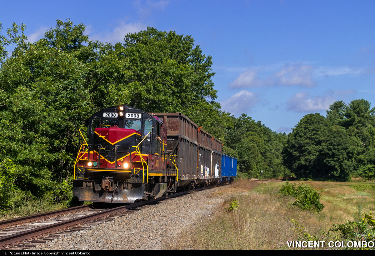 | Mass Coastal 2008, a former Canadian National unit, comes back from the CSX and MBTA interchange in Middleboro with construction and demolition empties and Mass DOT ballast hoppers for Rochester. The train passes cranberry bogs in South Middleboro. |