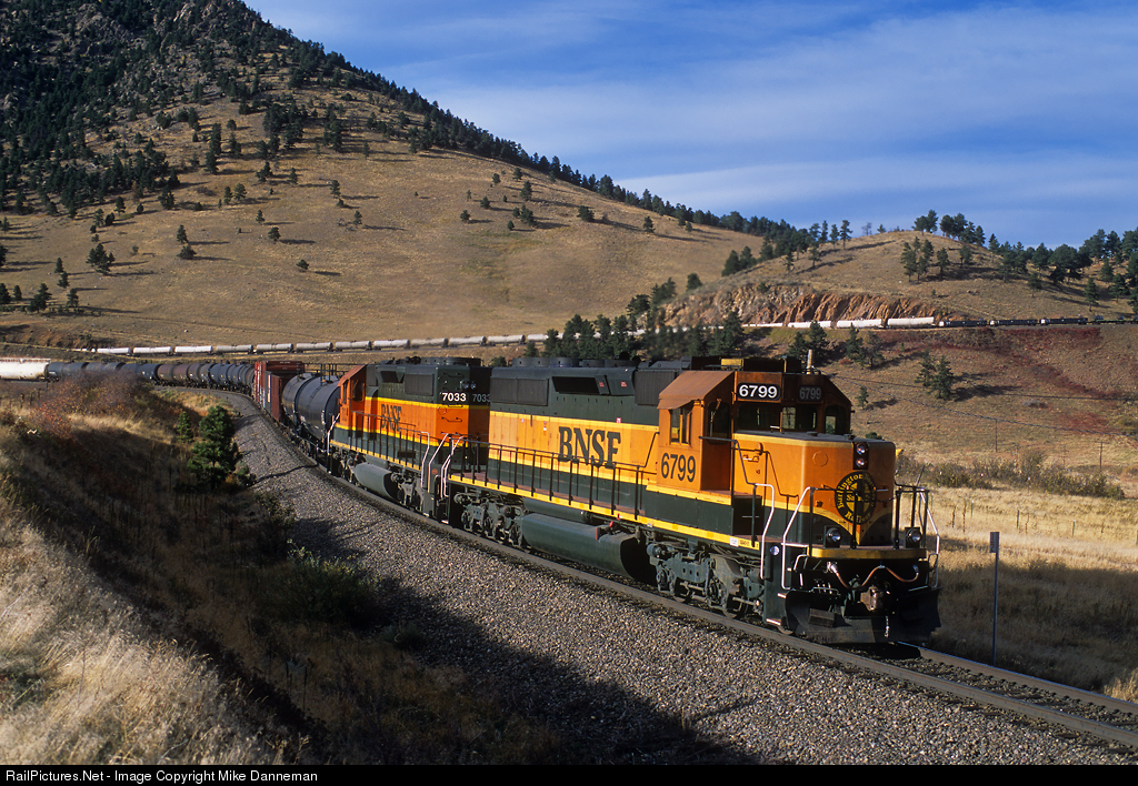 Burlington Northern Santa Fe’s Denver to Stockton manifest freight gets some help up the front range of the Rocky Mountains from a pair of EMD SD40-2 helpers on the rear. The head end of the train is already passing through Tunnel 1, while the pushers have just cleared Blue Mountain Drive grade crossing west of Clay, Colorado, on October 19, 2001.