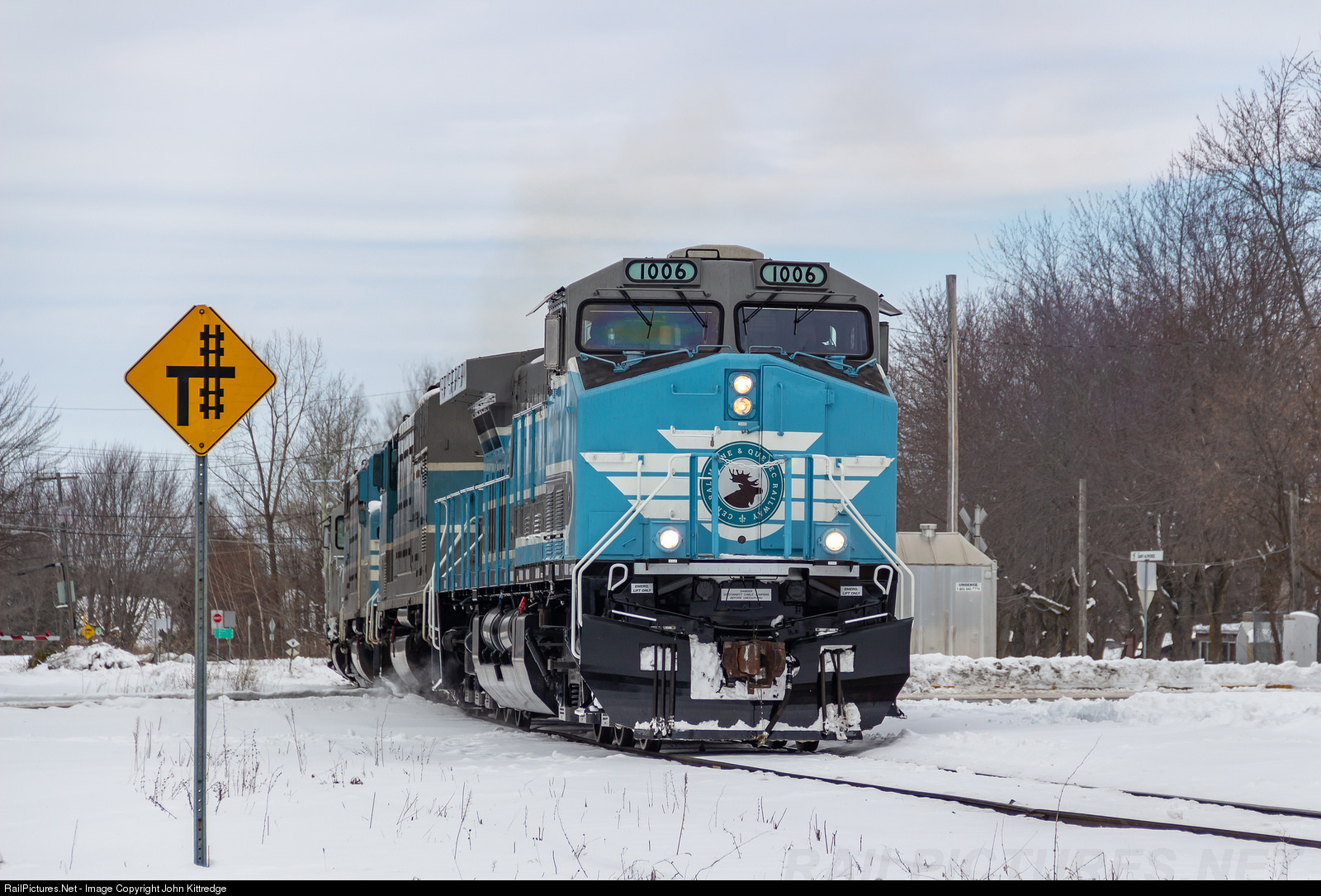 | In March 2018, one of the big buzzes in New England was the arrival of the first of two AC4400 locomotives on the Central Maine and Quebec. These units were long term leased from CIT. Having only been on the property a short time, 1006 shines as it leads 2 SD40-2F's and an SD40-2 into the Farnham Yard past an interesting looking crossing sign. |