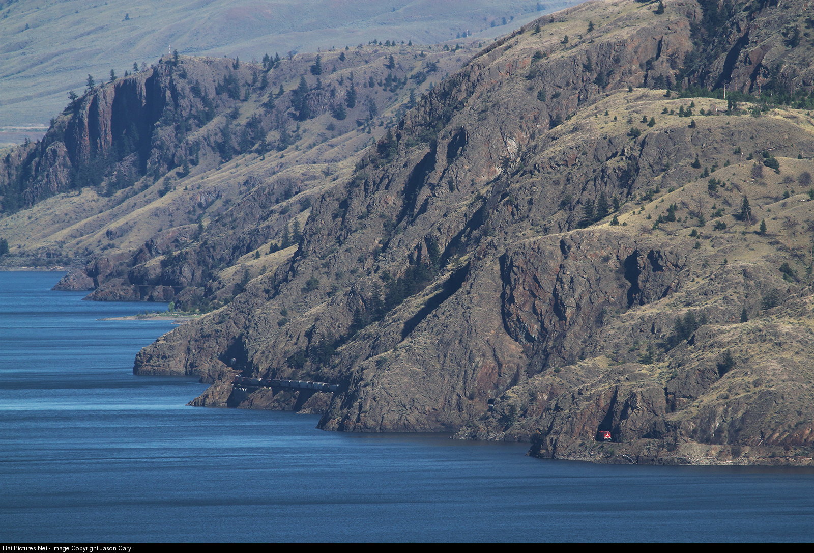A Canadian Pacific grain load skirts the rugged shore of Kamloops Lake on its westward journey. The scenic lake along the Thompson River is known as a warm lake and is popular for recreational sports....