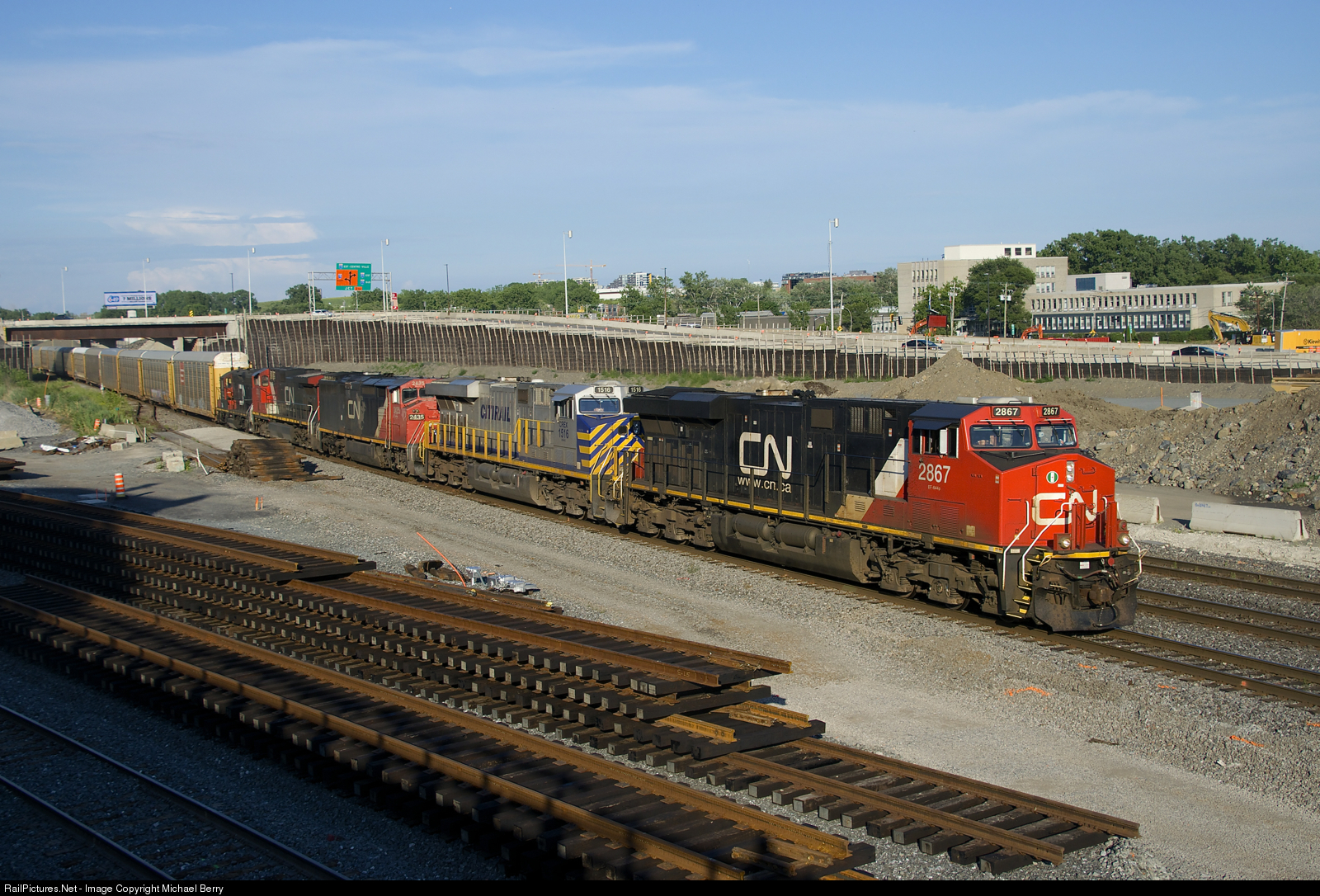 | On the soon to be ex-right of way. A late CN 401 has a lot of power (CN 2867, CREX 1516, CN 2435, IC 2725 & CN 7032) as it passes by Turcot West. The right of way that it is traveling on is supposed to replaced by a new right of way that curves to the left by the end of the month. Already one of the four tracks here (the transfer track) has been removed here. |