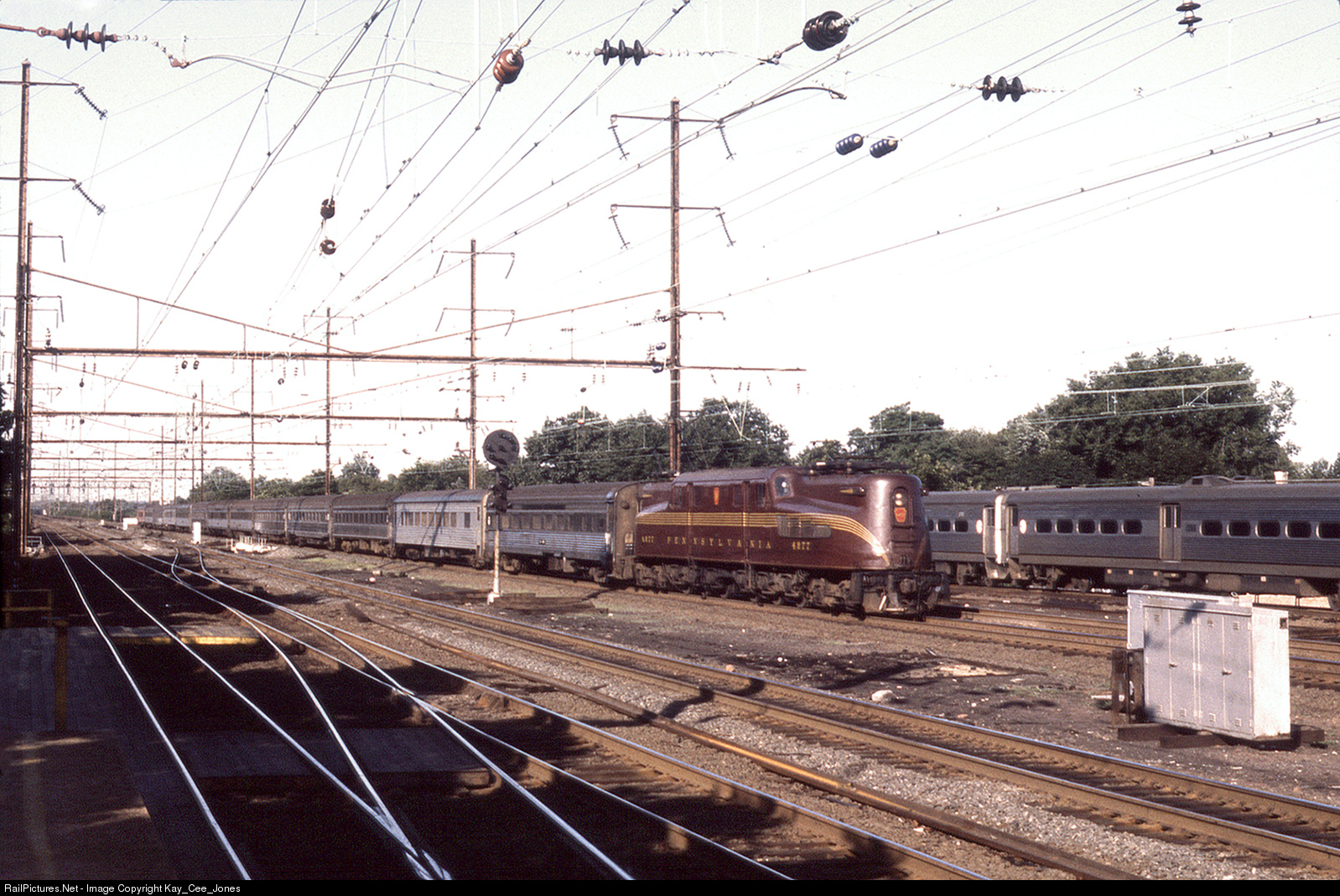 GG-1 4877 going eastbound and is approaching Rahway station. It's pulling thirteen passenger coaches with the "club" car on the rear.