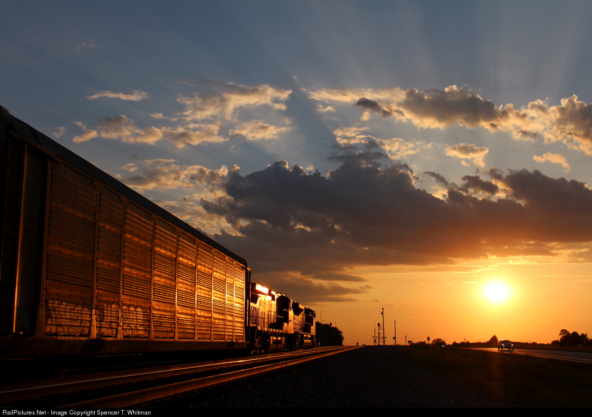 Sunrays shine bright above the clouds as a waiting, westbound autorack train idles in the siding at diggins on a gorgeous evening.