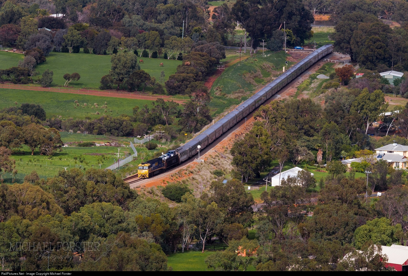 | The eastbound "Indian Pacific" with NR90 leading is only 35 minutes into its luxurious cross country trip to Sydney as it passes through the very scenic Swan Valley region of Western Australia. |