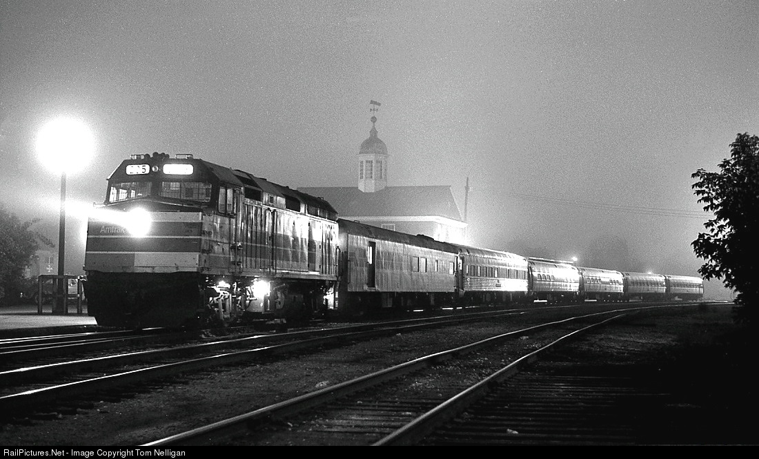 The sun won't be up for another hour as Amtrak's northbound Montrealer makes its predawn stop at White River Junction, VT, to change crews and pick up a few sleepy passengers. F40 205 leads a Montreal-bound consist that includes a Heritage baggage/dorm and sleeper in addition to an Amdinette and coaches.