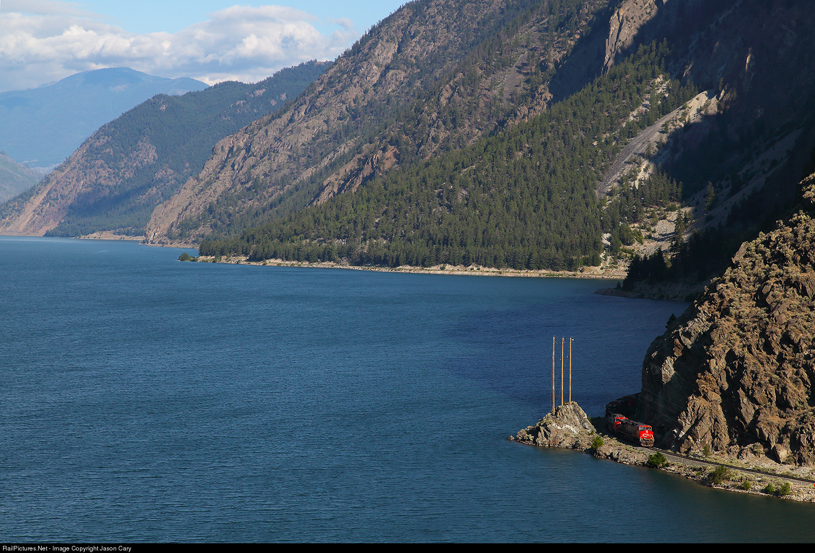 Train 571 rounds a tight corner along Seton Lake. The Lake is 1500 feet deep, that puts it well below sea level. The Lake has been the site of more than one train wreck as well; PGE #53 wrecked twice on the lake. The second time in 1953 PGE 2-8-0 #53 went to the bottom killing one crewman. In 1980 BCOL M630 711 and BCOL C425 808 hit a landslide killing the brakeman. The 800 was recovered, but the 711 went to the depths. In 1988 diving enthusiasts raised the M630, and it was sold for scrap.