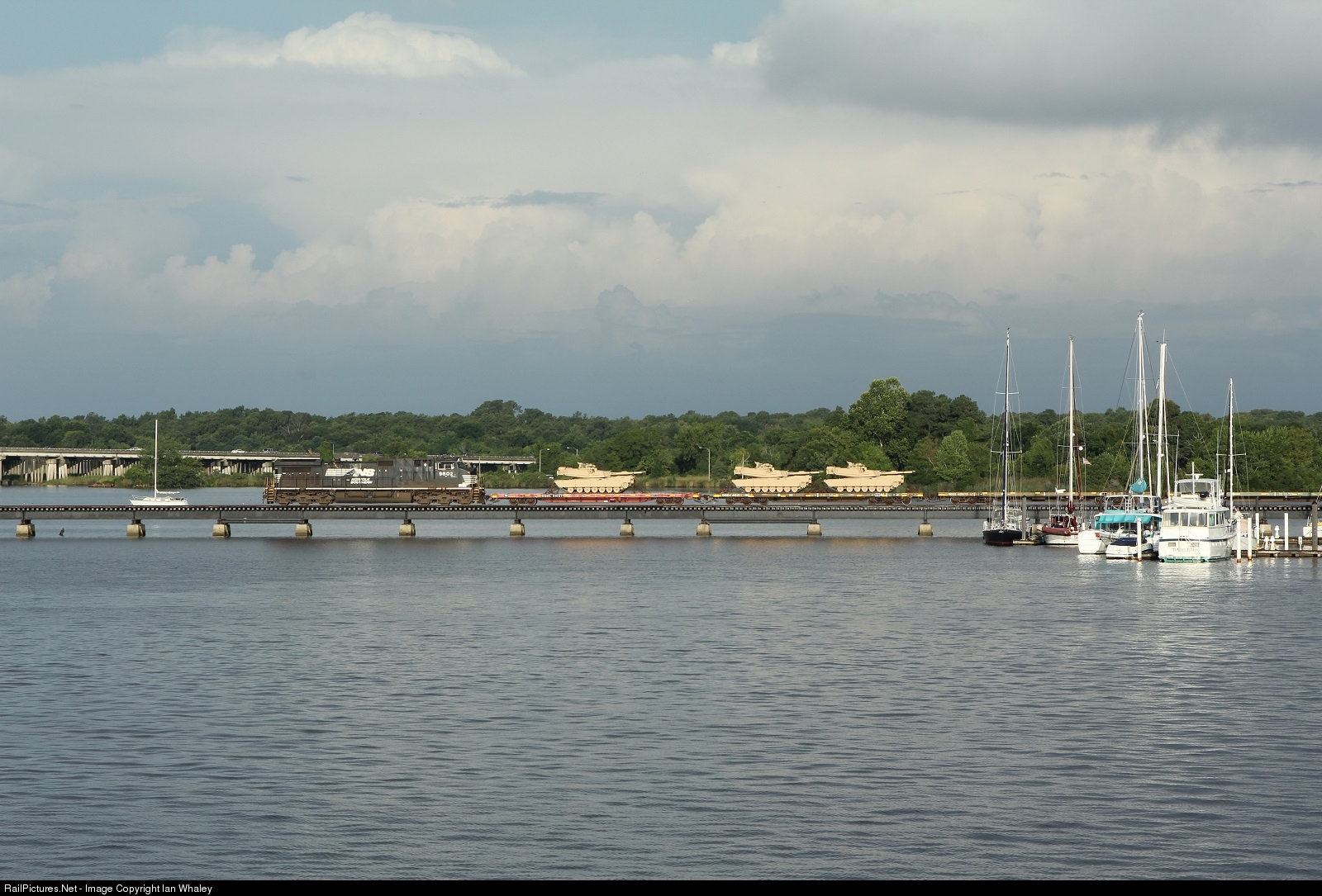 With a short train in tow for the Marine Corps Base at Camp Lejeune, NS E16 creeps across the Trent River Drawbridge in New Bern shortly after sunrise on a humid summer morning.