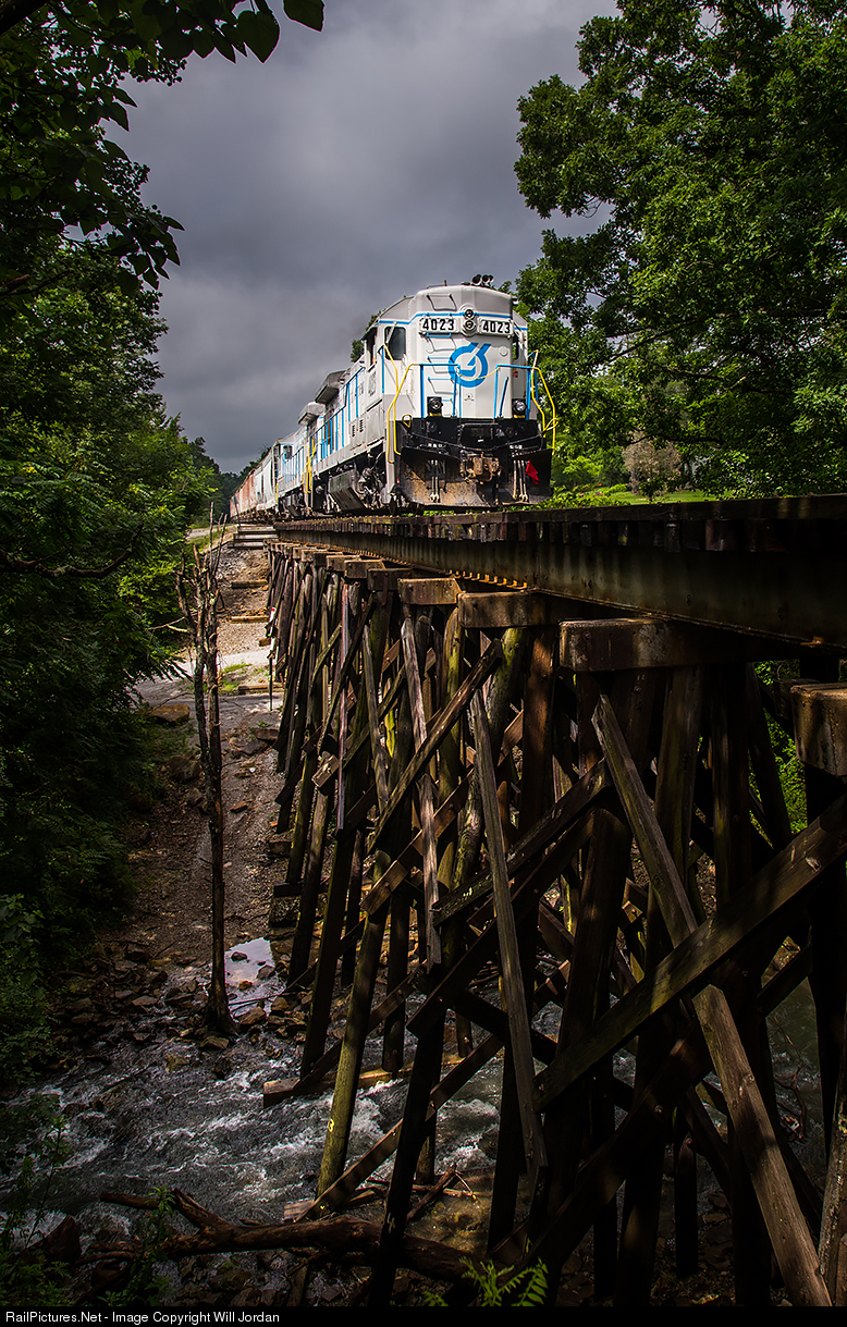 | A lucky break in the clouds lets the sun briefly light up the scene as one of Franklin Minerals' very rare Ex Southern Railway B23-7's leads the tri-weekly train over one of the numerous wooden trestles on the 16 mile line Between Crab Orchard and Rockwood, Tennessee in the Cumberland Mountains as dark clouds loom in the background. |