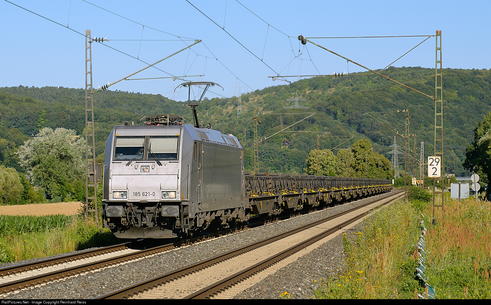 185 621 heads a rake of flat cars through the Main Valley near Karlstadt.