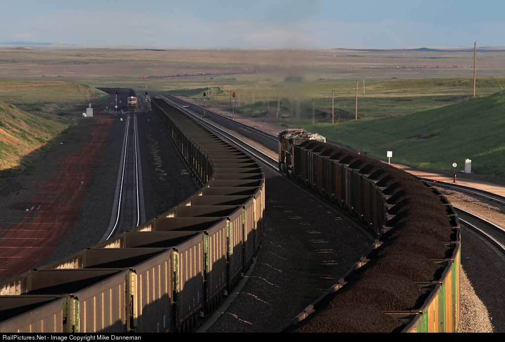 Wyoming’s Orin Line in Powder River Basin can still be busy at times. Here on Logan Hill, north of Bill, four trains are visible late in the afternoon of June 22, 2018. On Track 1, a southbound BNSF coal train will soon disappear around a curve, trailed by a lone SD70MAC DPU. Over on Track 2, a northbound Union Pacific coal empty rumbles, while a UP coal load still fighting gravity on the hill is headed south on Track 3. In the background headed north on Track 2 is a northbound BNSF coal empty, following the UP empty.
