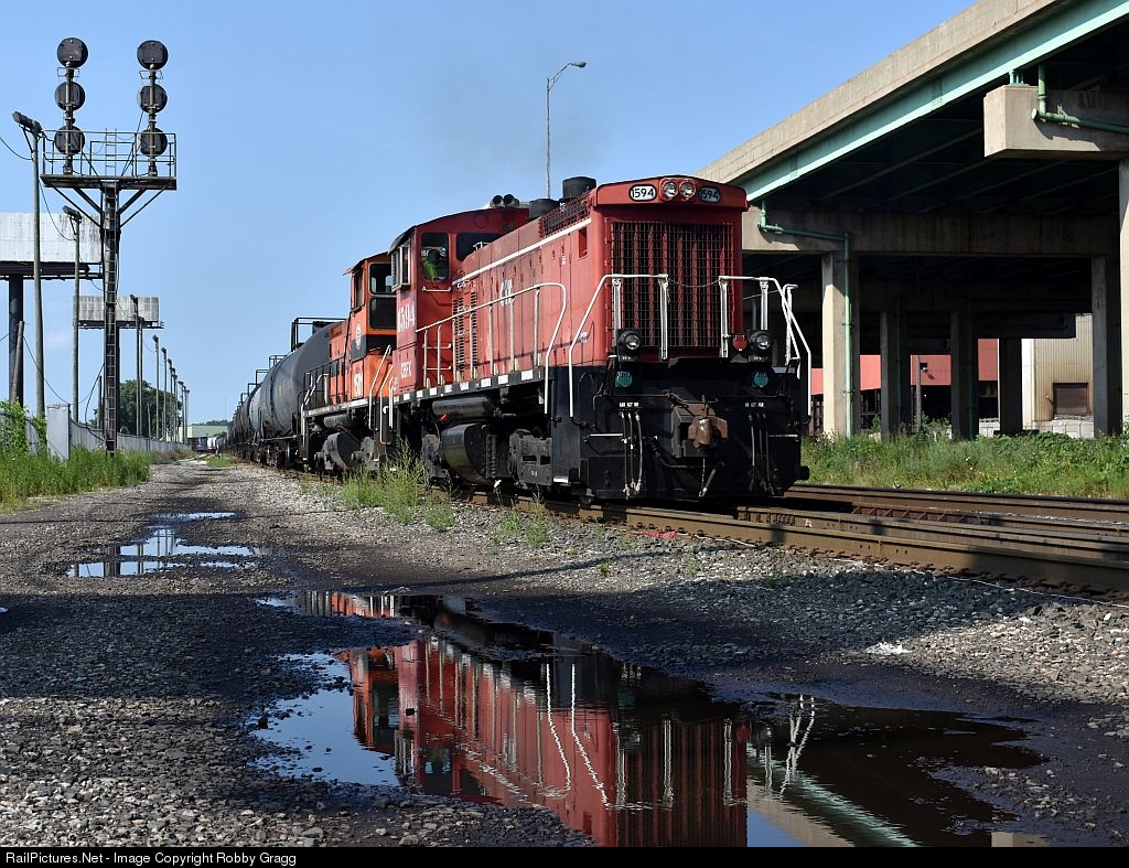 | CBFX SW1500 1594, a former TRRA unit, backs IHB 130 past the bracket signal at CP 100. |