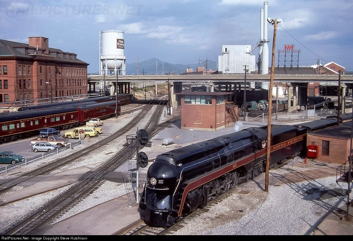 611 arrives back to Roanoke from a morning turn to Lynchburg. Major track work has been going on here to eliminate at-grade crossings of the Norfolk mainline and the Shenandoah mainline going off to the left. Randolph Tower is still keeping watch of all the train movements in the area. You can still make out the remains of the Roanoke Depot platforms that extended just east of the depot. The NW Roanoke Shops sign stands proudly atop the East End Shops complex. There are no coal bunker extensions on 611's tender. And as it has been for many years, the NS Office Car Fleet is stationed and maintained here in Roanoke, the real heart of the old N&W.